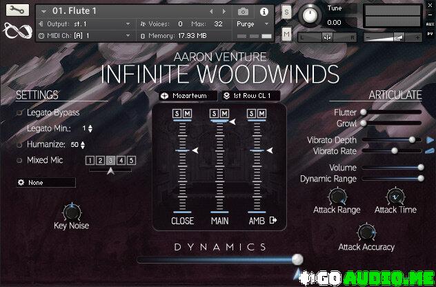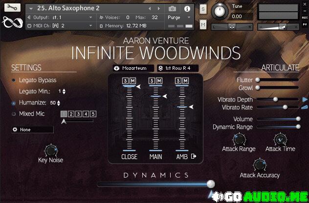 Infinite Woodwinds also includes playable Flutter, Growl, Vibrato Rate, Vibrato Depth sliders, as well as Attack Time and Attack Range knobs which allow you to adjust the attack response to your play-style.