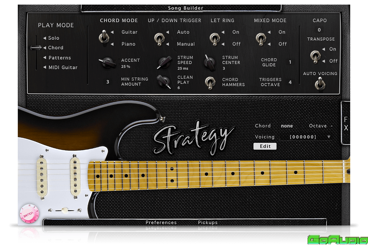 The Strategy can strum, in various ways, up, down, muted, in legato and allows finger picking. Everything is modeled after meticulously analyzing thousands of real chords played by guitarist. Every aspect of the strumming engine can be tweaked to achieve the sound you want.