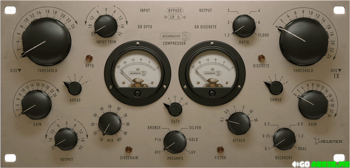 Aquamarine5 is a high-end mastering and mixing plugin suite which includes a monster compressor – sampled from one of the most highly regarded units on the market – featuring a smooth and warm sounding Opto comp section and a punchy, discrete VCA-style dynamic processor which can go from a subtle 1.2:1 ratio to savage ‘Flood’ limiting.