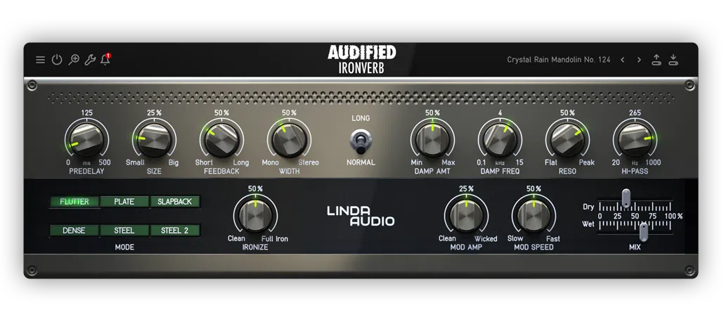 You can tweak IronVerb for your desires and needs by choosing from six different modes and a multitude of parameters and utilizing the signature Ironize modulation.