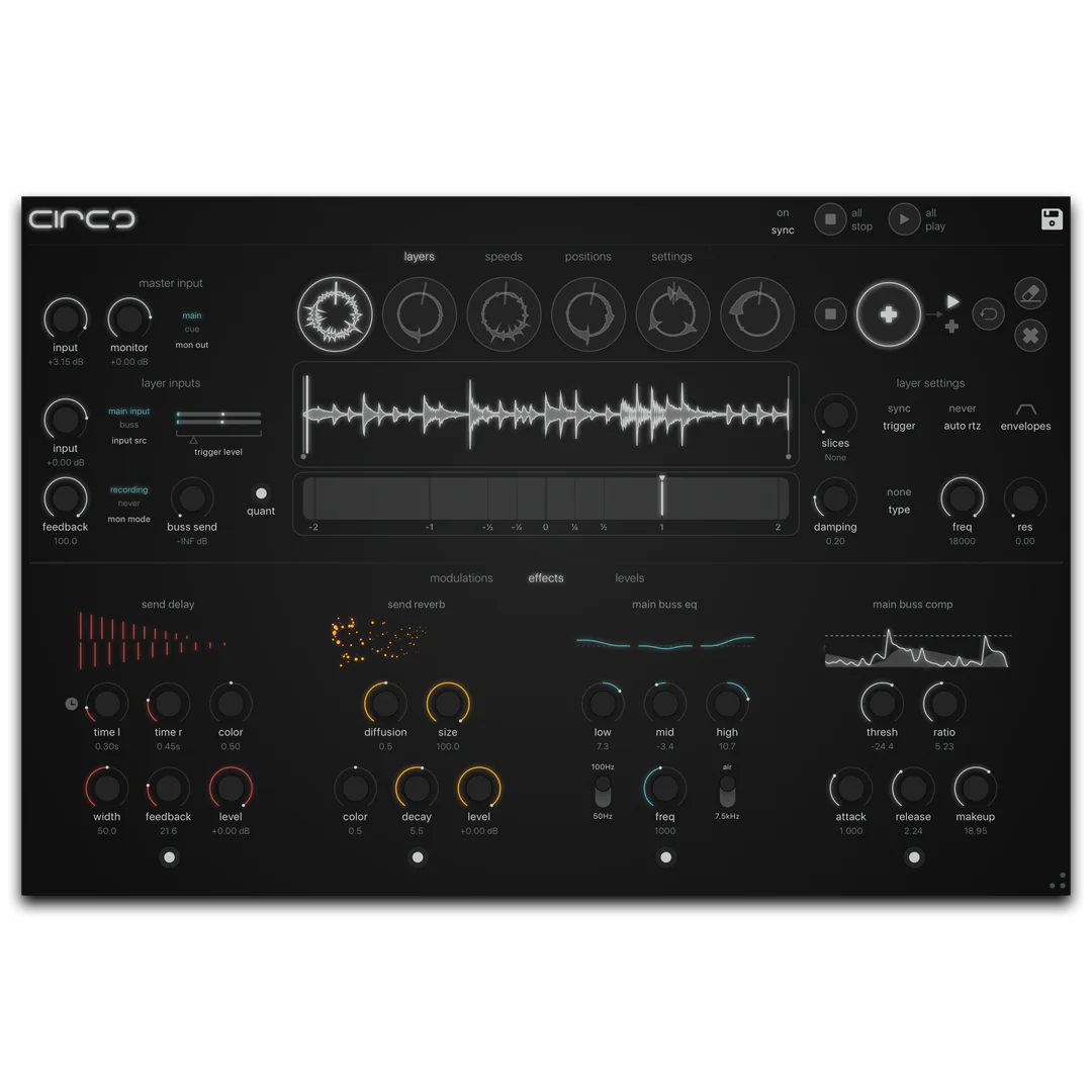 Each layer can sync to the host, a master loop, or free run, and can be triggered in sync, with an audio signal, or freely. Circa has seven stereo outputs (including a dedicated cue output for monitoring) and built-in reverb and delay. Add in a complete MIDI control system and Circa is a full looping workstation.