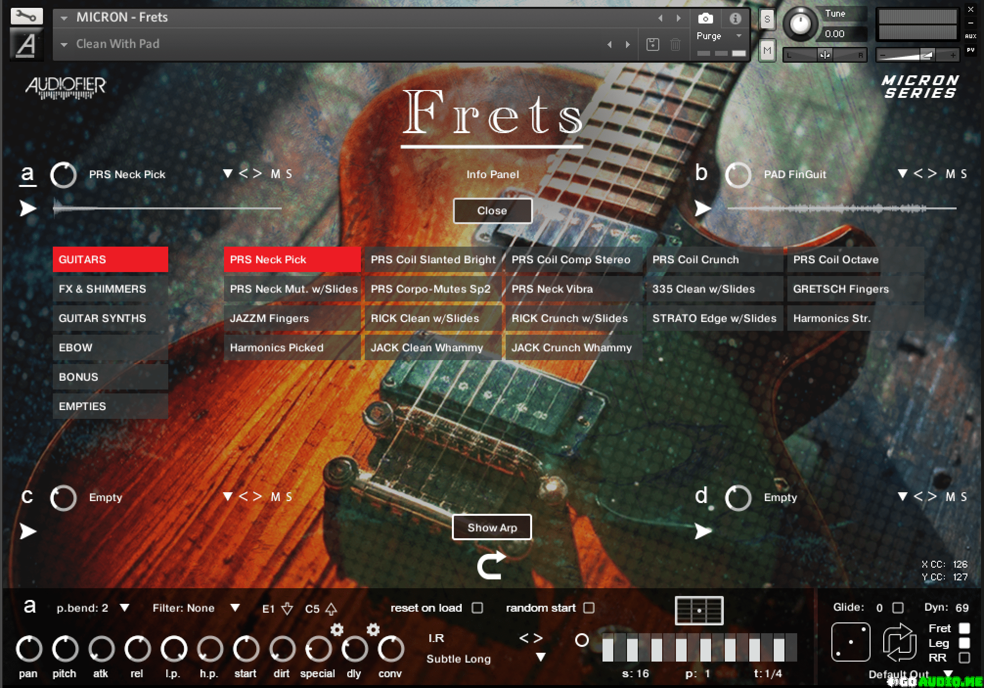 MICRON FRETS includes samples of several electric guitar, each with distinct articulations and techniques which suit best the sound. You will find Solid Bodies played with the pick, Hollow Bodies played with fingers, several Pick Ups options.*