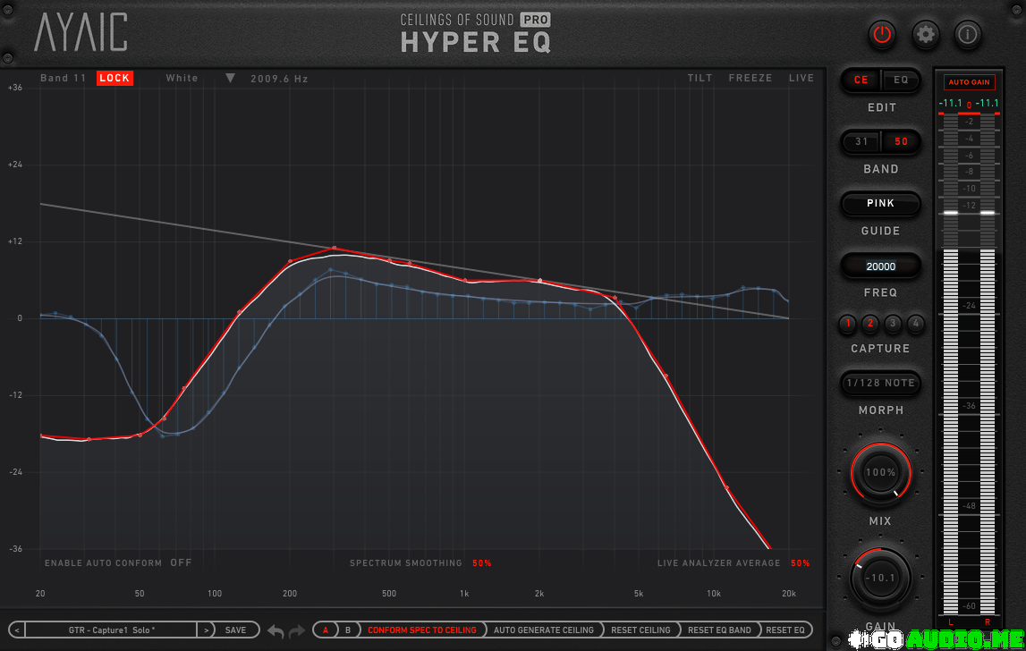 * 15 user-definable “ceiling” bands containing 49 noise-slopes each allow you to create sonic-ceiling shapes that drive the settings of a 50/31-band graphic equalizer. The EQ operates at 0 latency, low CPU load yet are hi-precision, even at low frequencies where it really matters.