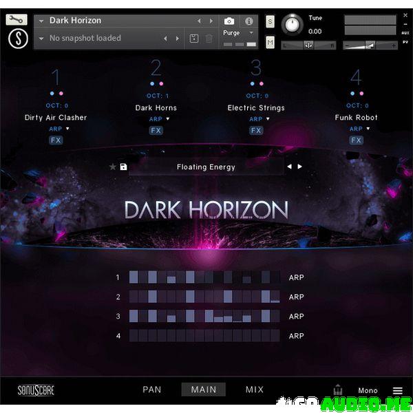+ Modified Ensemble Engine – Dark Horizon uses a modified version of the Elysion ensemble engine. This means you can play up to four different instrument modules at the same time, and each module allows independent controls for arpeggiators. Using the mod-wheel unlocks an astounding filter effect that produces a great number of kinetic, digital possibilities.