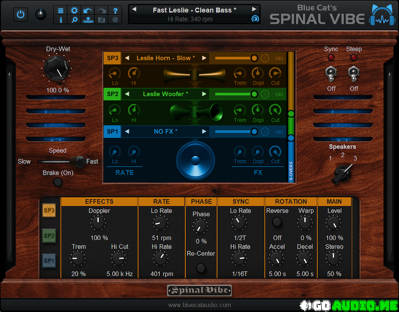 Spinal Vibe offers up to 3 rotative speakers, with full control over the rotational behavior of each speaker: you can not only select their rotation speed and curve, but also the amount of Doppler, amplitude modulation and dampening independently, as well as their acceleration and deceleration characteristics.