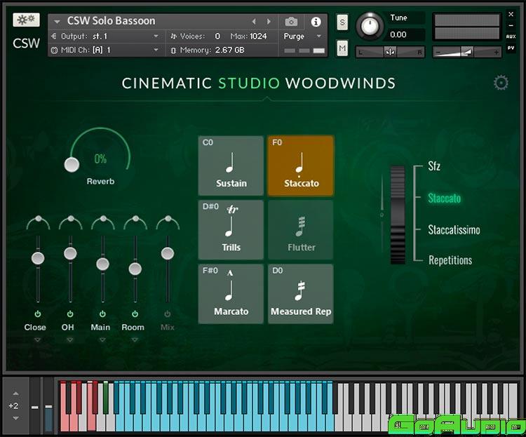 At the heart of Cinematic Studio Woodwinds is its intuitive and efficient GUI. This means one patch per instrument, easily assignable keyswitches and MIDI CCs, and a full mixer with output routing options plus reverb. To save memory, articulations can be loaded in or out of RAM with a couple of clicks. As the layout is functionally the same as for Cinematic Studio Strings and Brass, these features and many others are all accessible via the main GUI page.