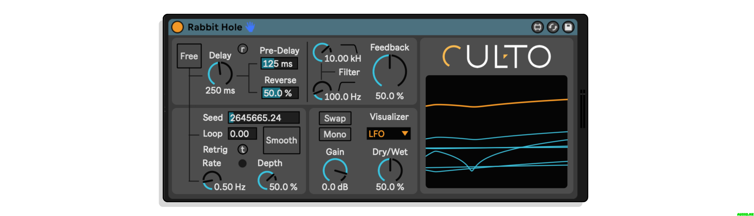 Rabbit Hole is the ultimate chaos modulation delay by Culto, where parallel modulators driven by a random function warp its delay lines into creating weird sonic events. It fills empty spaces in your samples, creating additional rhythmical layers and thick, swirling textures.