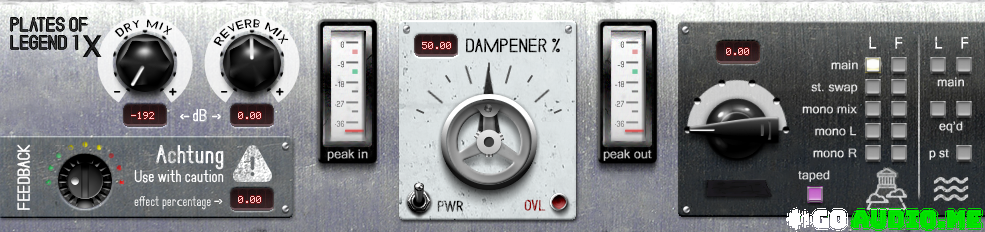 The first plate used solid state amplification and provides a big wide stereo reverberation (I’m naming it Olympus). The second was one of the earlier plates that used a tube amp and one pickup for a mono output (I named it Styx because of how murky it is). These two variations of this plate are known to provide very different results. Both were sampled to include a fully functional dampening control. It sounds and works great. You won’t find too many other Nebula reverbs with sampled adjustable controls in them, besides some of the other ones I’ve done.