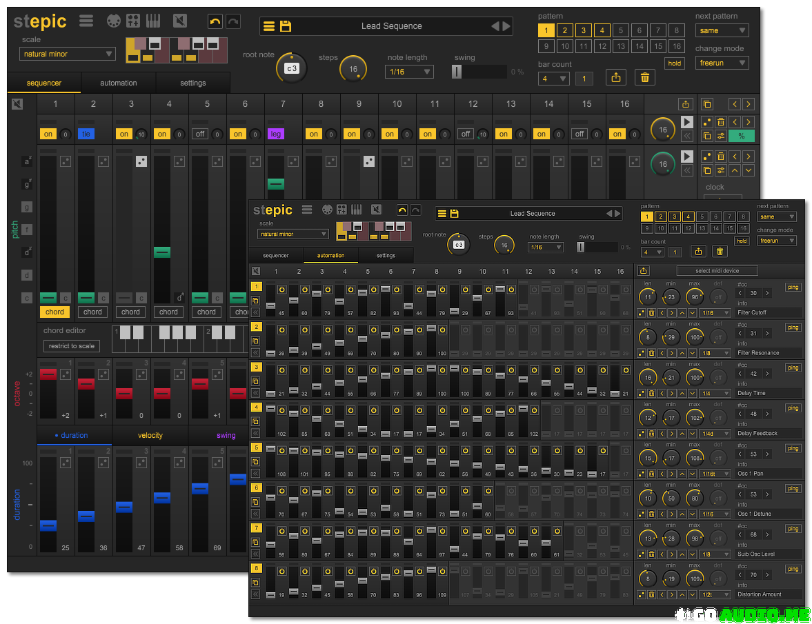 Stepic isn’t just a powerful and versatile polyphonic step sequencer. 8 additional and fully integrated modulation sequencers make it a true sound shaping tool. Use them to automate any parameter (e.g. Filter Cutoff, Wavetable Position, Effect Amount) of your favorite synthesizers or effect devices. With its support for MIDI CC, Stepic offers you parameter control for both software plug-ins and hardware devices.