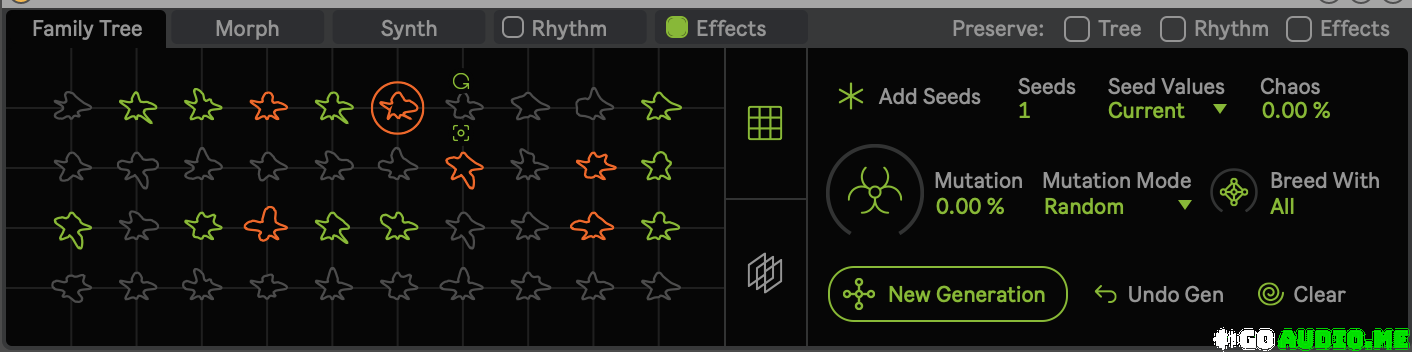 Two modes for adding ‘seed’ presets: (1) current values of the device with optional random spreading (this way you can also load in adv presets and add them as seeds to the tree). (2) Randomized seeds