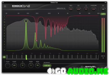 The resonance EQ section is where the power of Knocktonal really shines. This is the primary place where usage will occur. The resonance EQ is designed to push a root note, and all accompanying harmonic overtones, both even and odd. You can also set the resonance EQ to Octave mode by turning off the Overtones button, which allows control over all octaves of the root note. As with the subtractive EQ, the additive resonance EQ can be controlled both statically, and dynamically via automation or MIDI input.