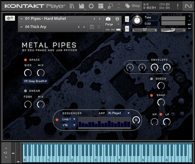 Each instrument comes with many carefully crafted snapshots, to help you explore the versatility of the Metal Pipes & Plates, get started quickly, and be instantly inspired