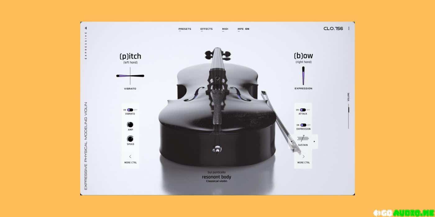 Physically modeled solo strings, VLN 356, the violin, VLA 419, the viola, CLO 759 the cello and DBS 1130, the double bass, designed for MPE and MIDI controllers, offering intuitive real-time control over articulation, bowing, vibrato, and dynamics.