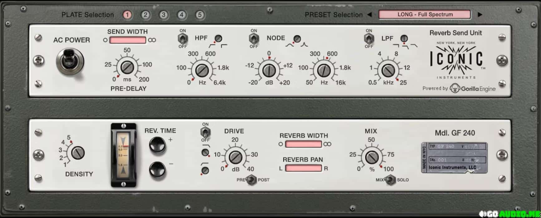 Powered by Gorilla Engine, and made in collaboration with Numerical Sound, the GF240 includes classic functionality, like a pre-delay control, send width, a filter section with high- and low-pass filters, as well as a shapable node, tail length control from a full 6 seconds down to a mere 20ms (much shorter than an analog unit) and a mix control with a convenient solo switch to preview only the reverberation.