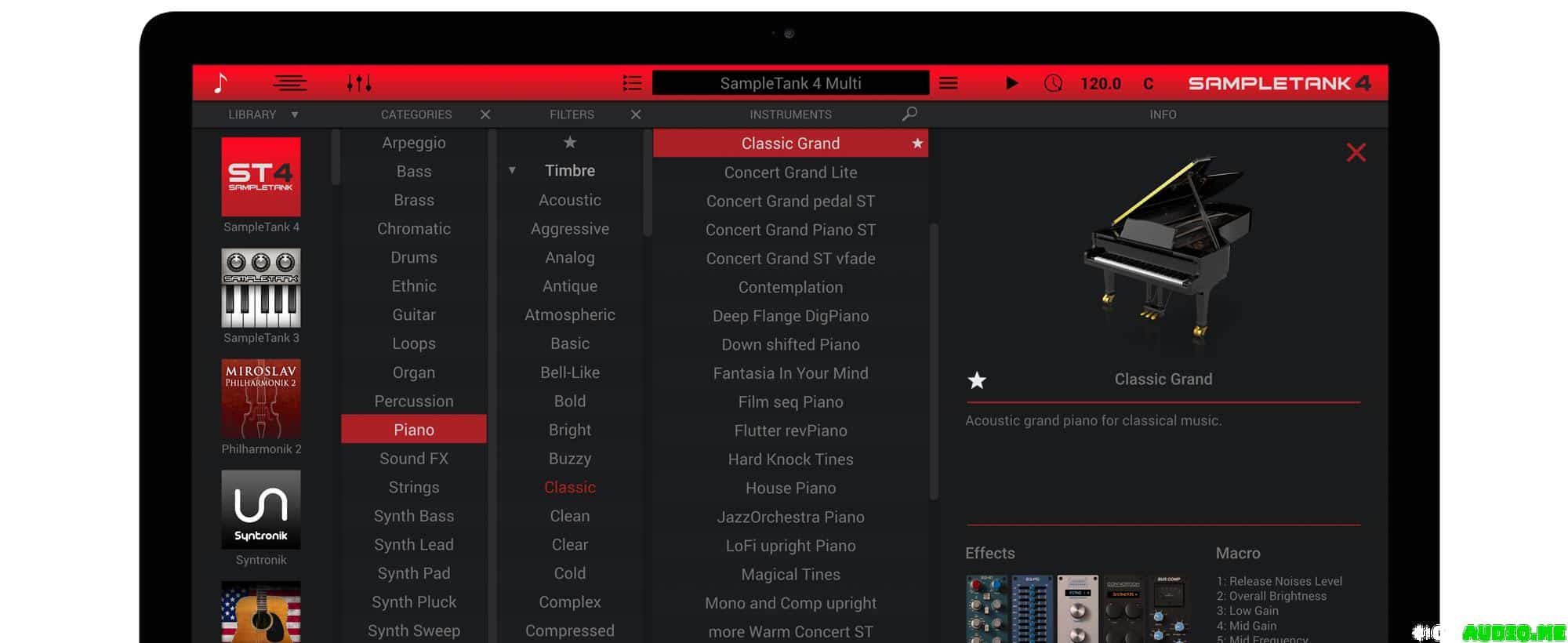SampleTank 4 offers a massively expanded sample library (up to 8,000 sounds across 250 GB of samples) and a completely redesigned, scalable/zoomable interface. The new library features high-end recordings of all new concert pianos, keyboards, guitars, bass, drums, strings, brass, synths, vocals, percussion and more, all with articulations and round robins for the most realistic performance yet, with over 120,000 new samples added.
