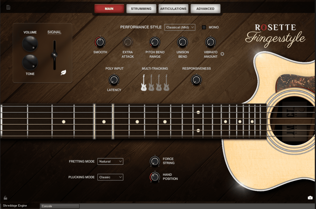 Introducing Rosette Fingerstyle, the first in our new Rosette line of acoustic guitars. We sampled a gorgeous steel-stringed Taylor 414ce acoustic in obsessive detail: every string, every fret, every finger, with two mics and even a DI signal. An improved, expanded guitar engine lets you easily customize the virtual player’s performance to breathe life into your music, no matter how intricate or nuanced.