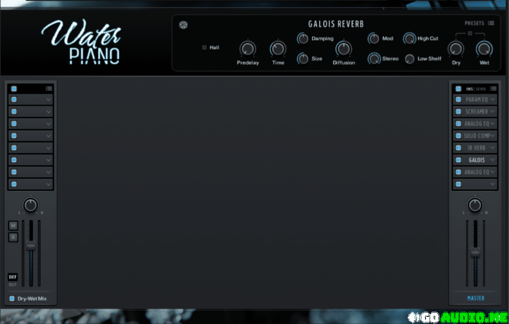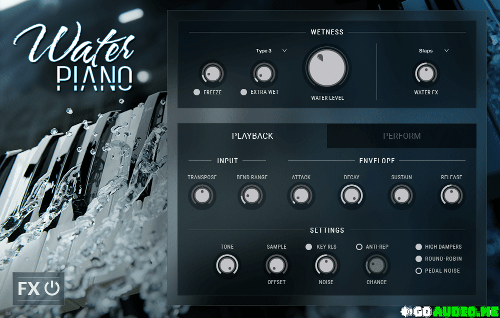“Extra Wet” control morphs the output of the piano with a running river, with four separate lengths of IR available from short to extra-long.