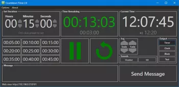 A countdown timer for Windows, written for show operators by a show operator. Simple intuitive user interface with plenty of options hidden underneath. Displays time remaining, current time and a message to a secondary display. Full network control via a suitable controller e.g. Stream Deck with Bitfocus Companion. Trigger audio clips at set timer values.