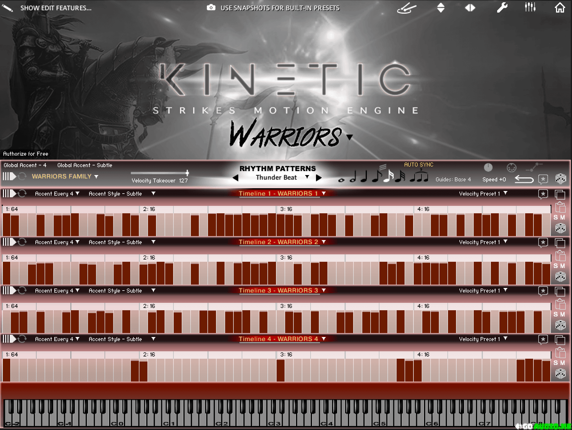 With Kinetic Percussion, you have a vast arsenal of percussion themes and keymaps at your fingertips! Up to 4 timelines where each timeline can have any one of 28 different percussion keymaps. Each timeline contains 64 note or rest events and can be divided into up to 4 “regions”. And you can have each timeline play a different pattern whether you hold down a single note or chord!