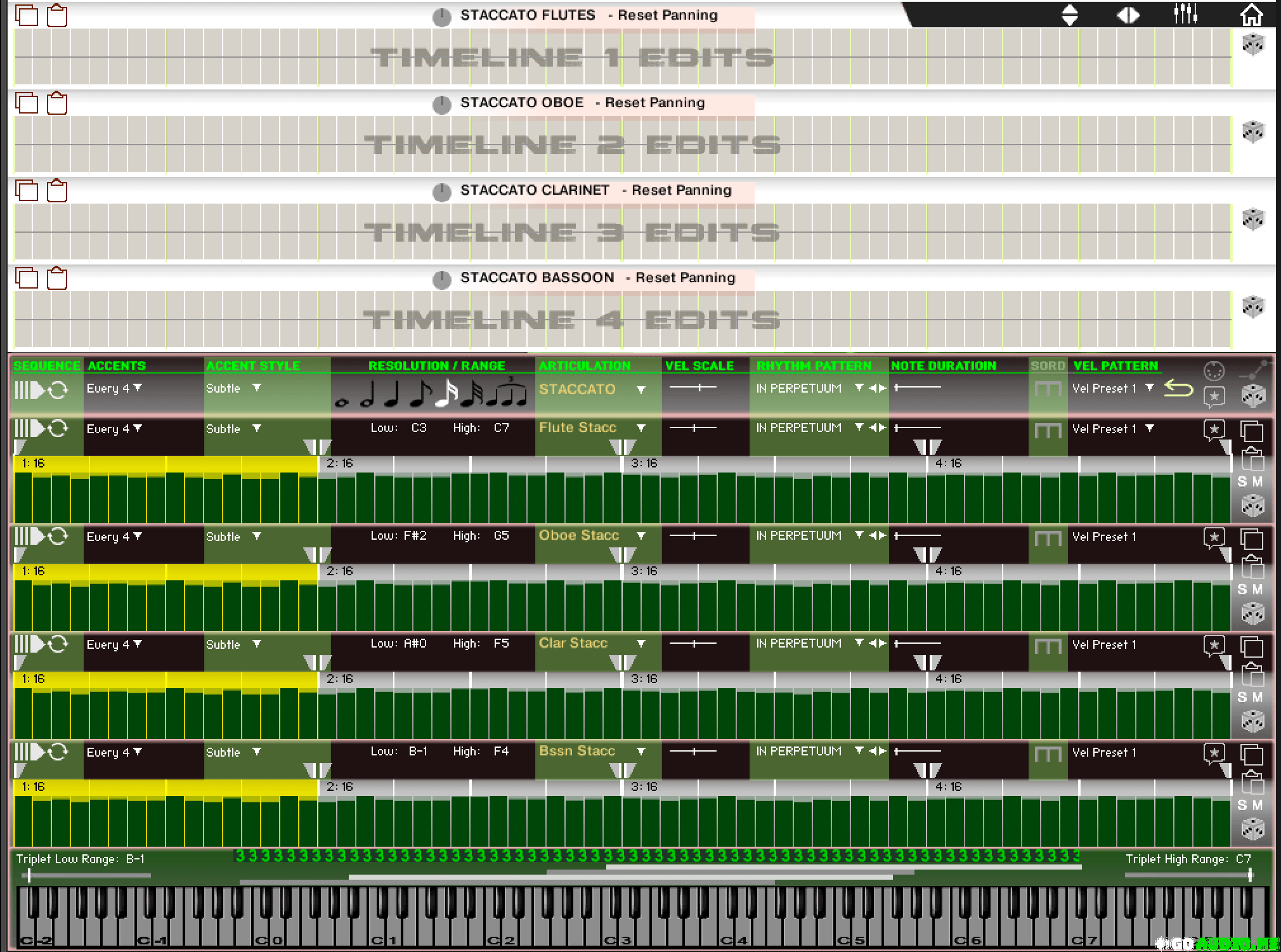 At the time of this publication, there does not exist another instrument that can let you play FOUR short-sample Woodwinds sections (flutes, oboes, clarinets and bassoons) at the SAME TIME. But wit Kinetic, you get the entire Woodwinds section in one instrument. That means you get a separate timeline for each section. Each timeline contains 64 note or rest events and can be divided into up to 4 “regions”. And you can have each timeline play a different pattern whether you hold down a single note or chord!