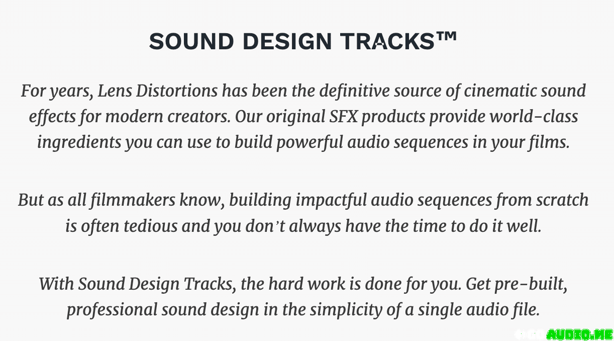 With Sound Design Tracks, the hard work is done for you. Get pre-built, professional sound design in the simplicity of a single audio file.