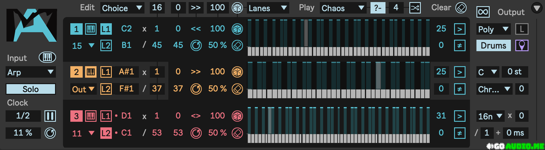 Each strand features seven parameter lanes: gate, choice between two selected note pitches per strand, velocity, chance of playback, note length, offset delay, and assignable control change. All lanes come with their own parameter controls, including Euclidean options for gate and note to rapidly generate compelling patterns.