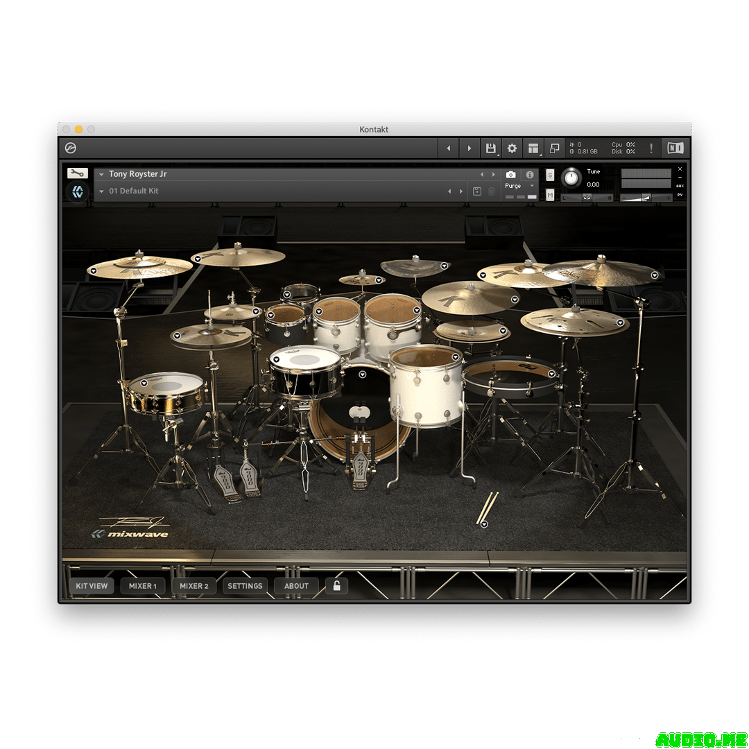 Featuring 13 drums with 6 snare drum options and an array of 11 cymbals, sampled and mixed at MixWave Studios.