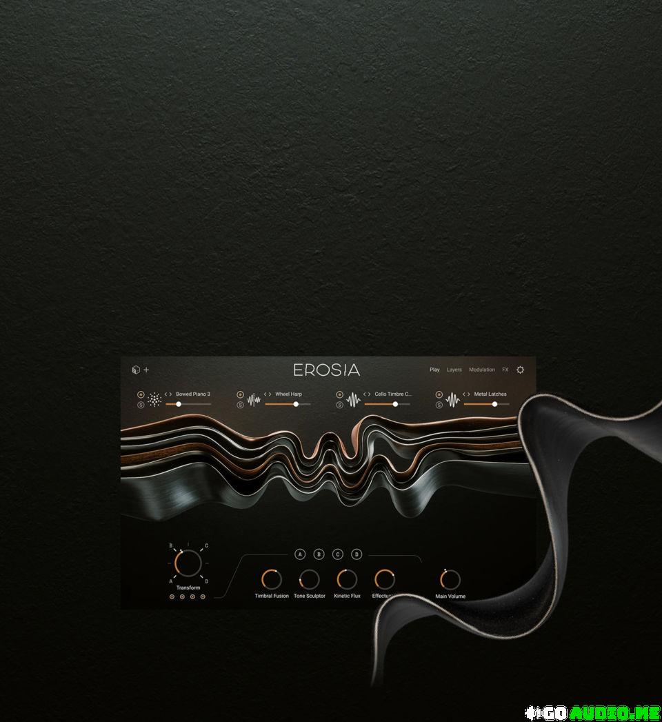 Four layers form Erosia’s core: a Grain layer that fractures and animates textures, plus three interchangeable Sampler or Wavetable layers. Together, they create instruments that feel alive, organic, and unpredictable. Streamlined Play and FX pages let you shape sound quickly and intuitively, while the Transform control evolves timbres, moving seamlessly between tension, release, and decay.