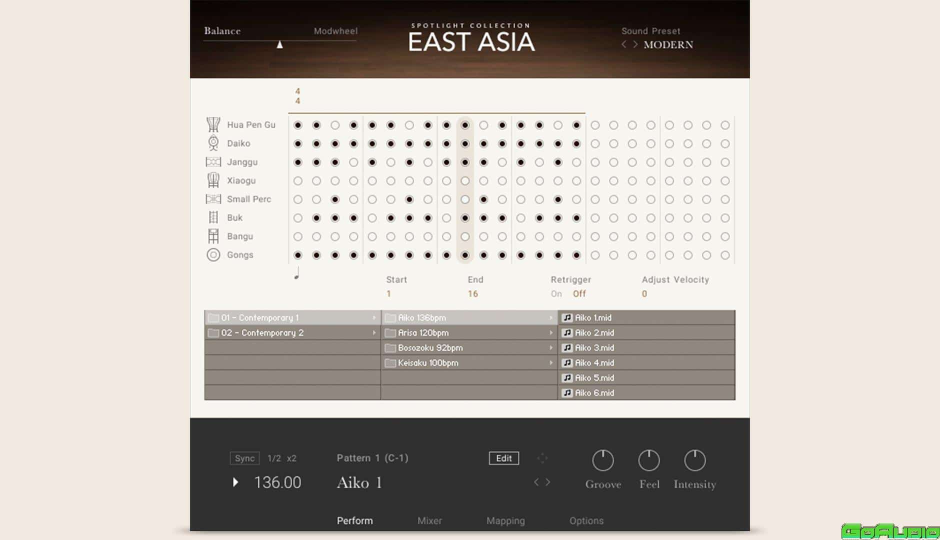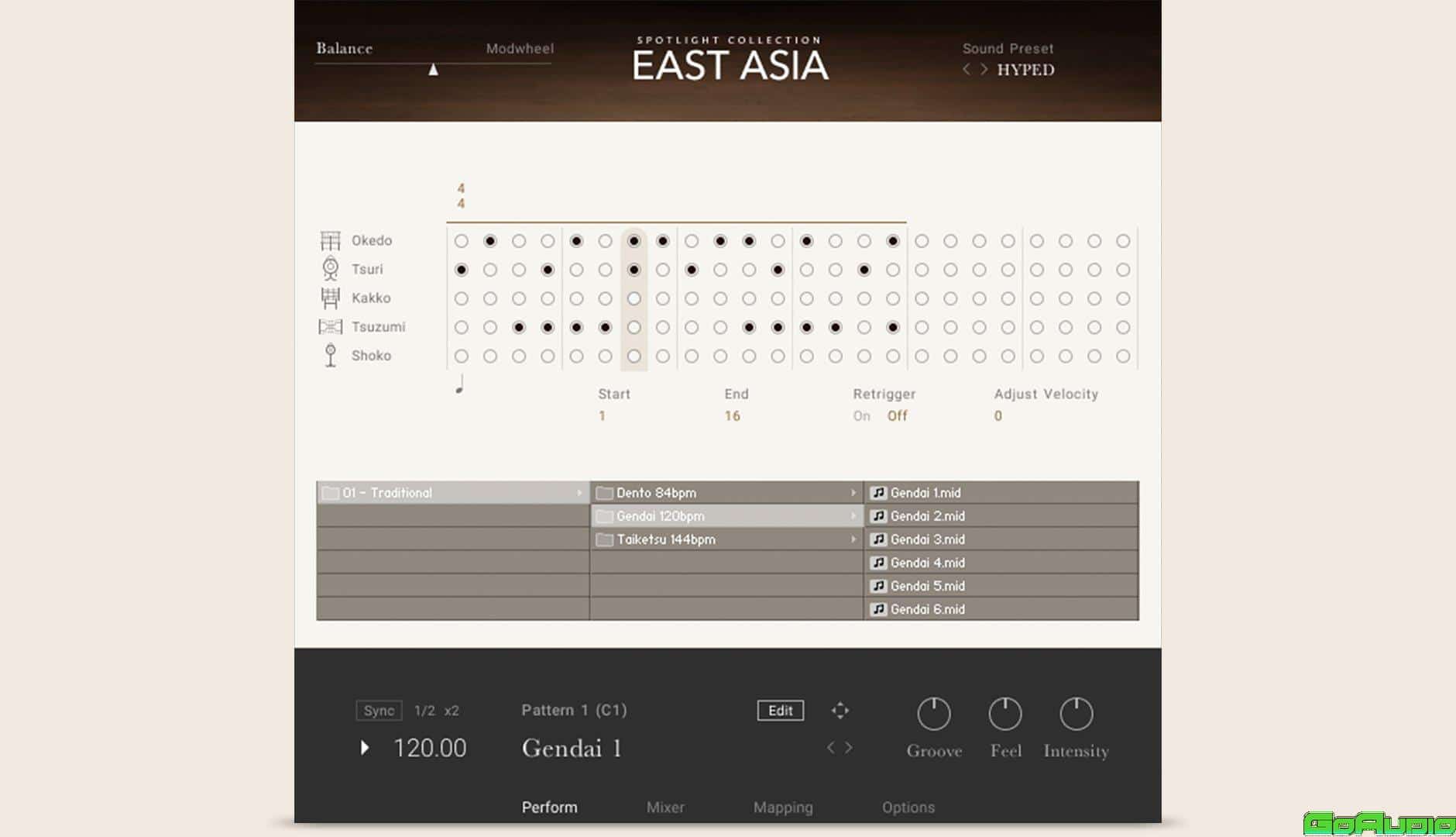 Whether you’re creating soundscapes with a specific regional flavor or giving character to modern electronic productions, EAST ASIA gives you an extensive range of instantly recognizable sounds including drums, gongs, cymbals, and woodblocks. Choose from 24 percussion instruments that can be free-played individually or as part of bespoke ensembles. Each instrument and ensemble comes with an array of preset grooves which can be further tweaked with intuitive macro controls.