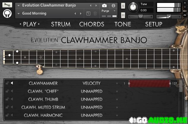 Evolution Clawhammer Banjo is hosted by our Evolution engine, which provides you with a wealth of appointments: built-in patterns that instantly get you authentic clawhammer rhythms, a comprehensive collection of effects, and a generous amount of settings to tailor the instrument to your performance needs.