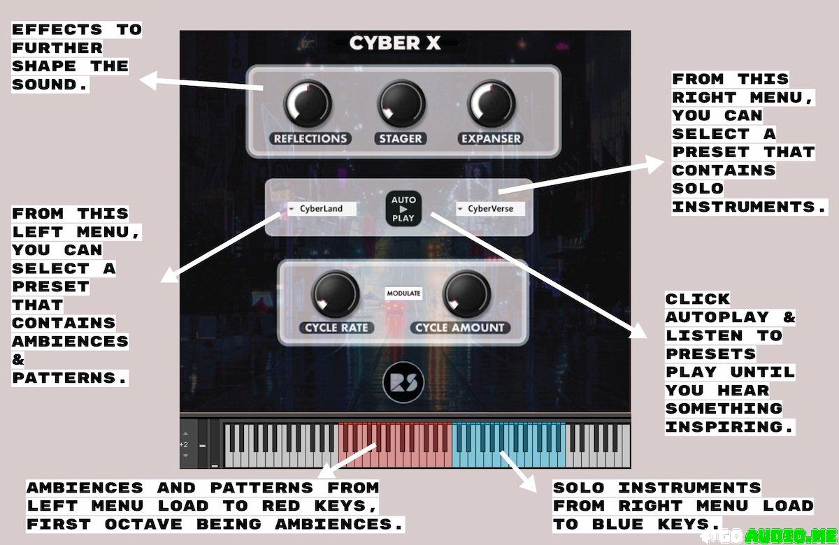 The Kontakt engine we built for Cyber X is simple yet inspiring. It can play you the presets with Auto Play function, offers 2 menus to select solo instruments and ambiences, patterns separately which can be played together afterwards.