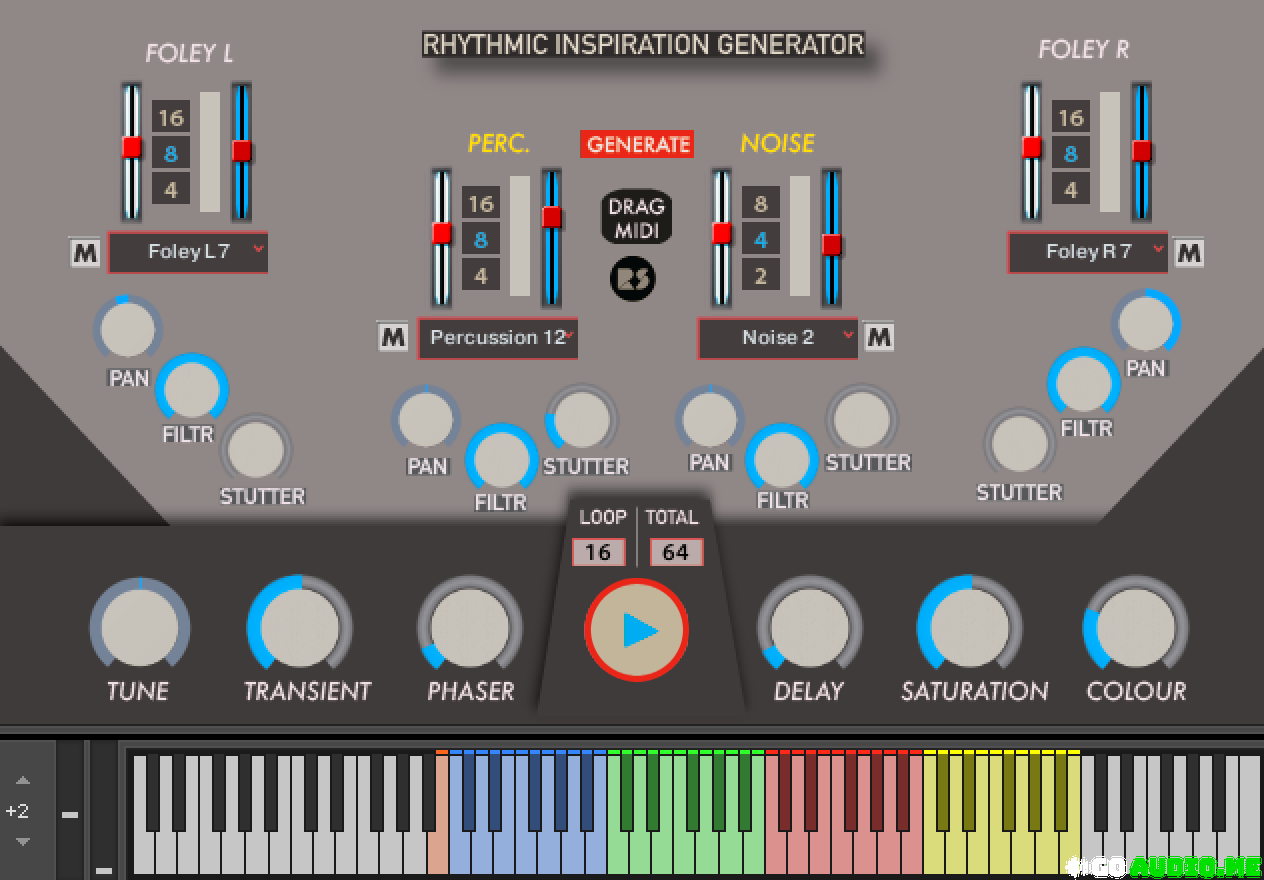 RIG is a rhythmic pattern maker fuelled by a smart possibility algorithm, a wealth of percussive sounds and dual length controls to help create unique long patterns with natural variety. RIG is available for Kontakt.
