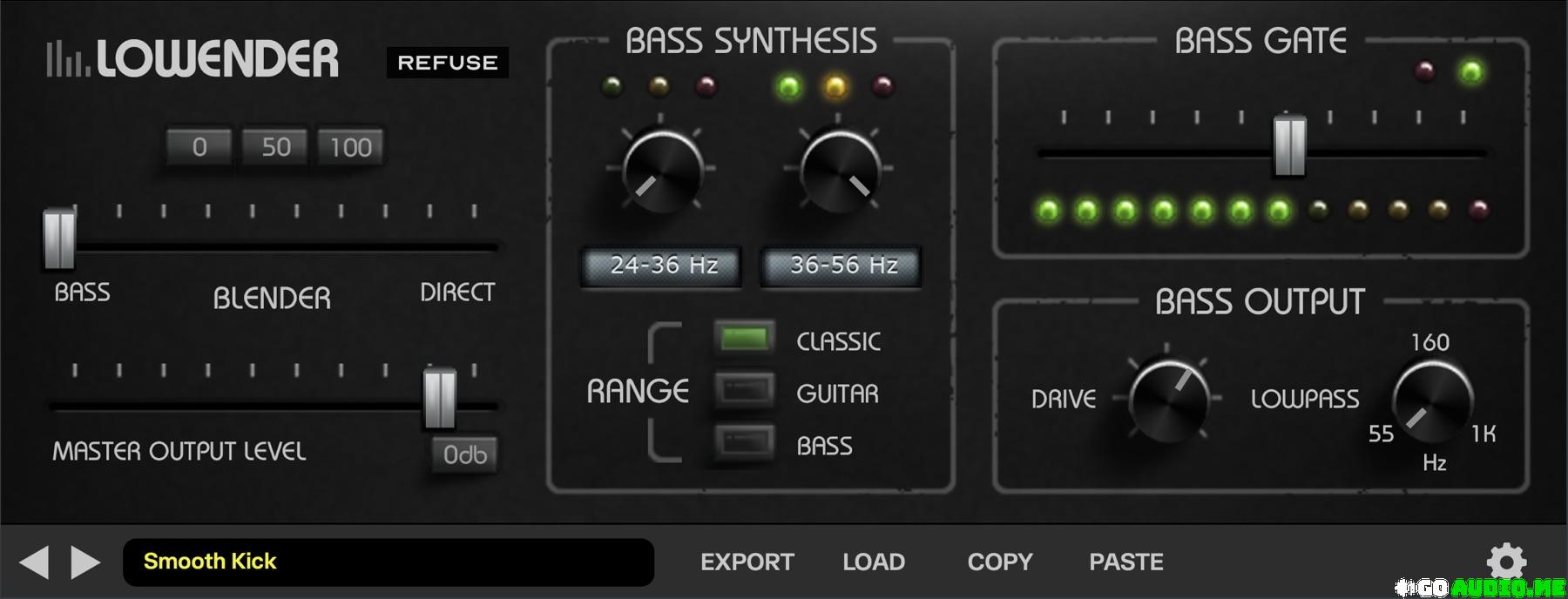 Second, the generated subharmonics pass through a gate tailored for low frequencies, which is useful for cleaning up unwanted bass rumble (e.g. from between kick drum hits in a drum loop).