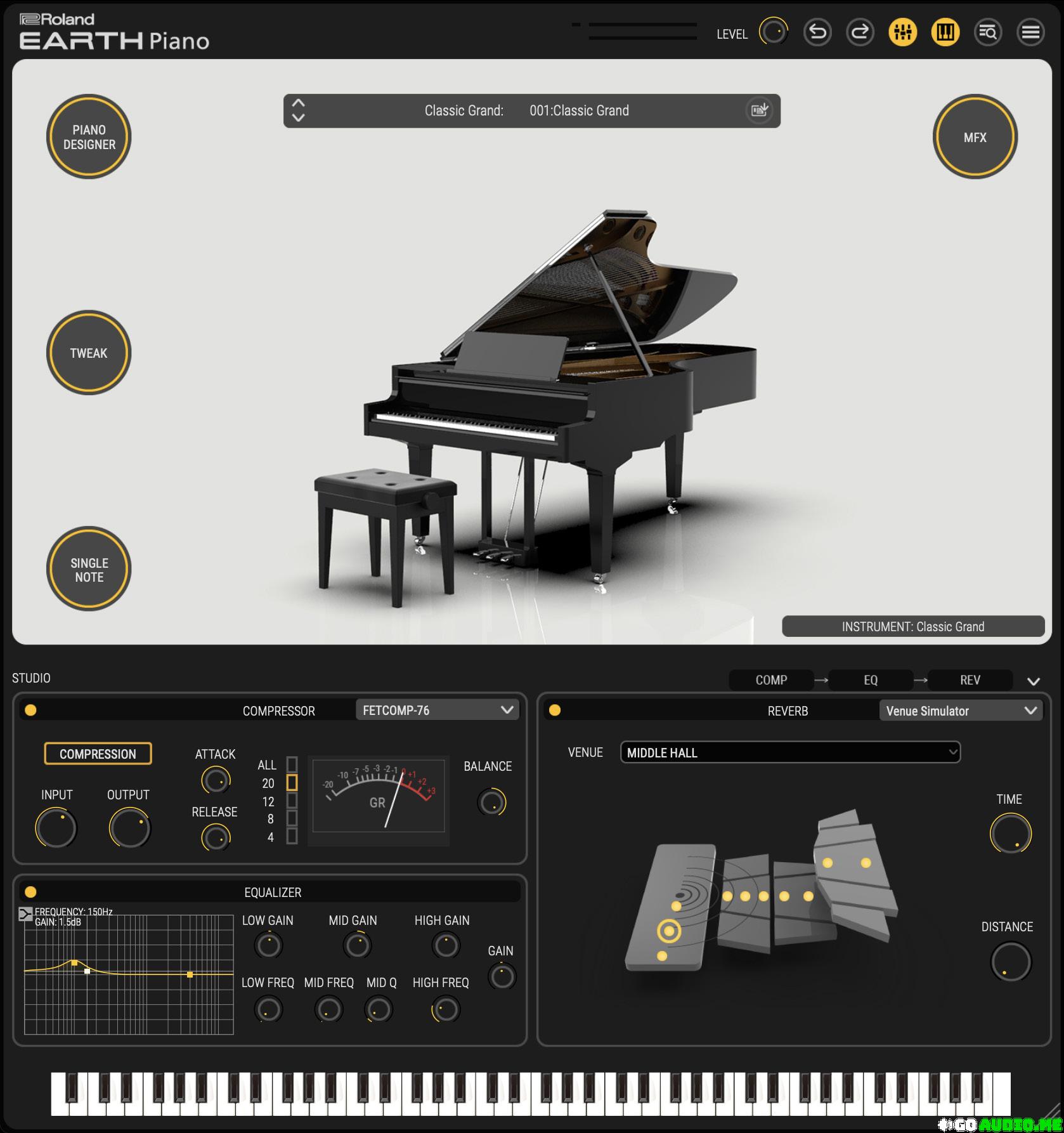 Dial in just the right sound with EARTH Piano’s integrated suite of studio-grade effects. Shape the overall tone with the powerful three-band EQ. Then use the compressor and its versatile FET, optical, and VCA modes to create the ideal dynamic response for a performance or a track.