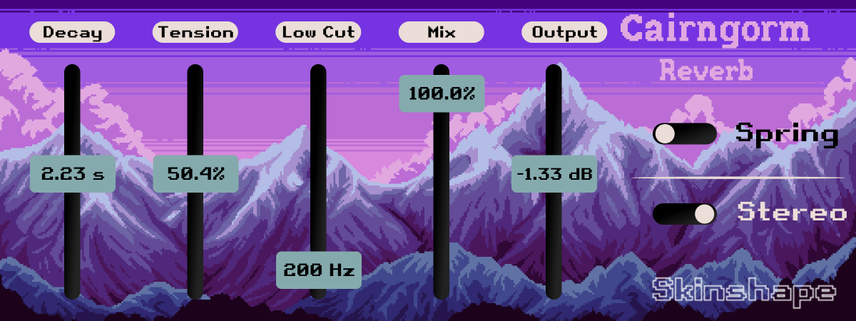 Cairngorm Reverb is named after one of the oldest mountain ranges in the World, located in the Highlands of central Scotland. Inspired by spring reverbs such as the Fisher Space Expander K-10 and other vintage models, the aim was to make something that sounded like those and apply it to a modern plugin. It was later developed to have an option to turn the spring on or off, with the added option of having a springless reverb sound, that is deep and lush.