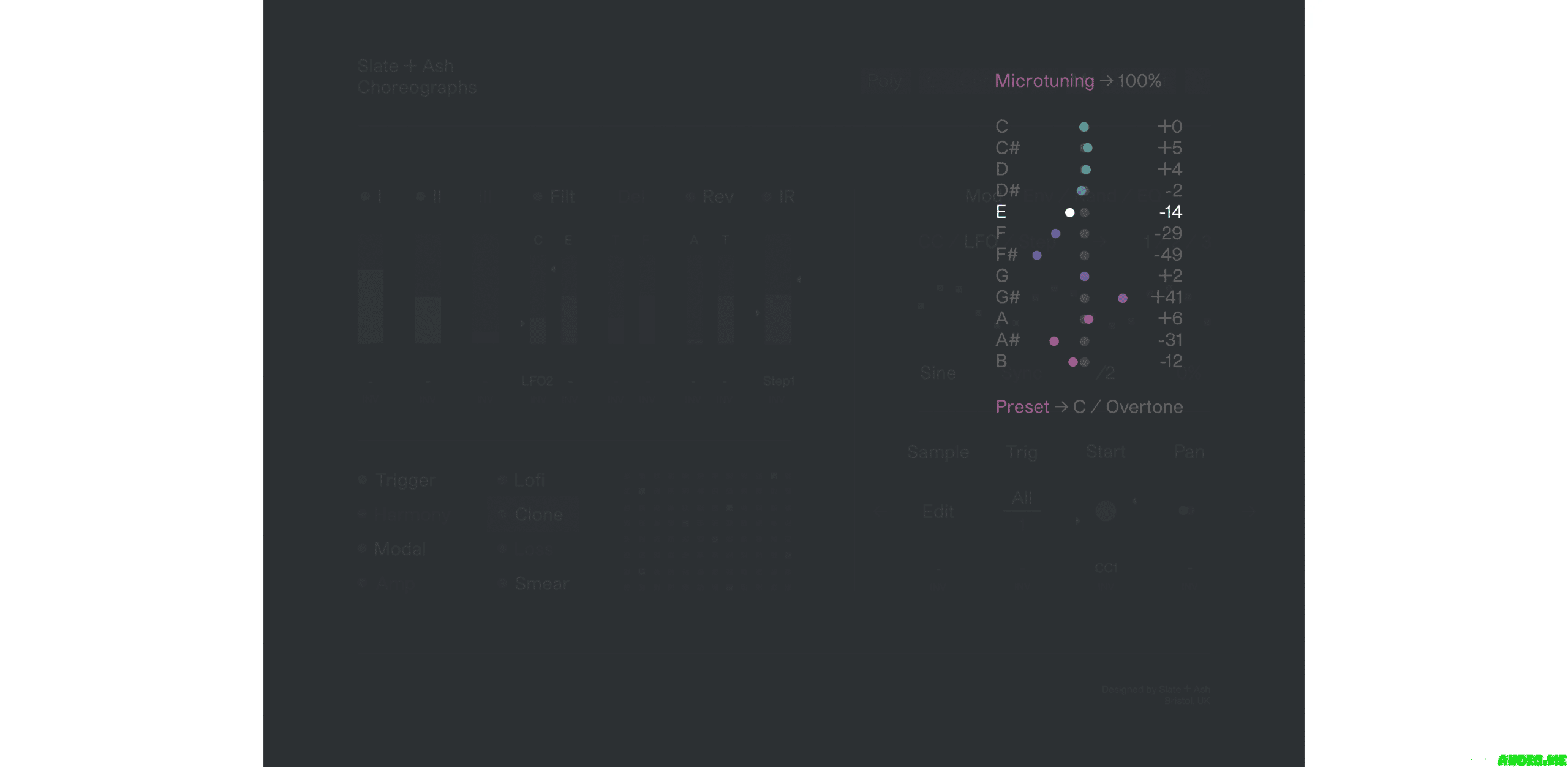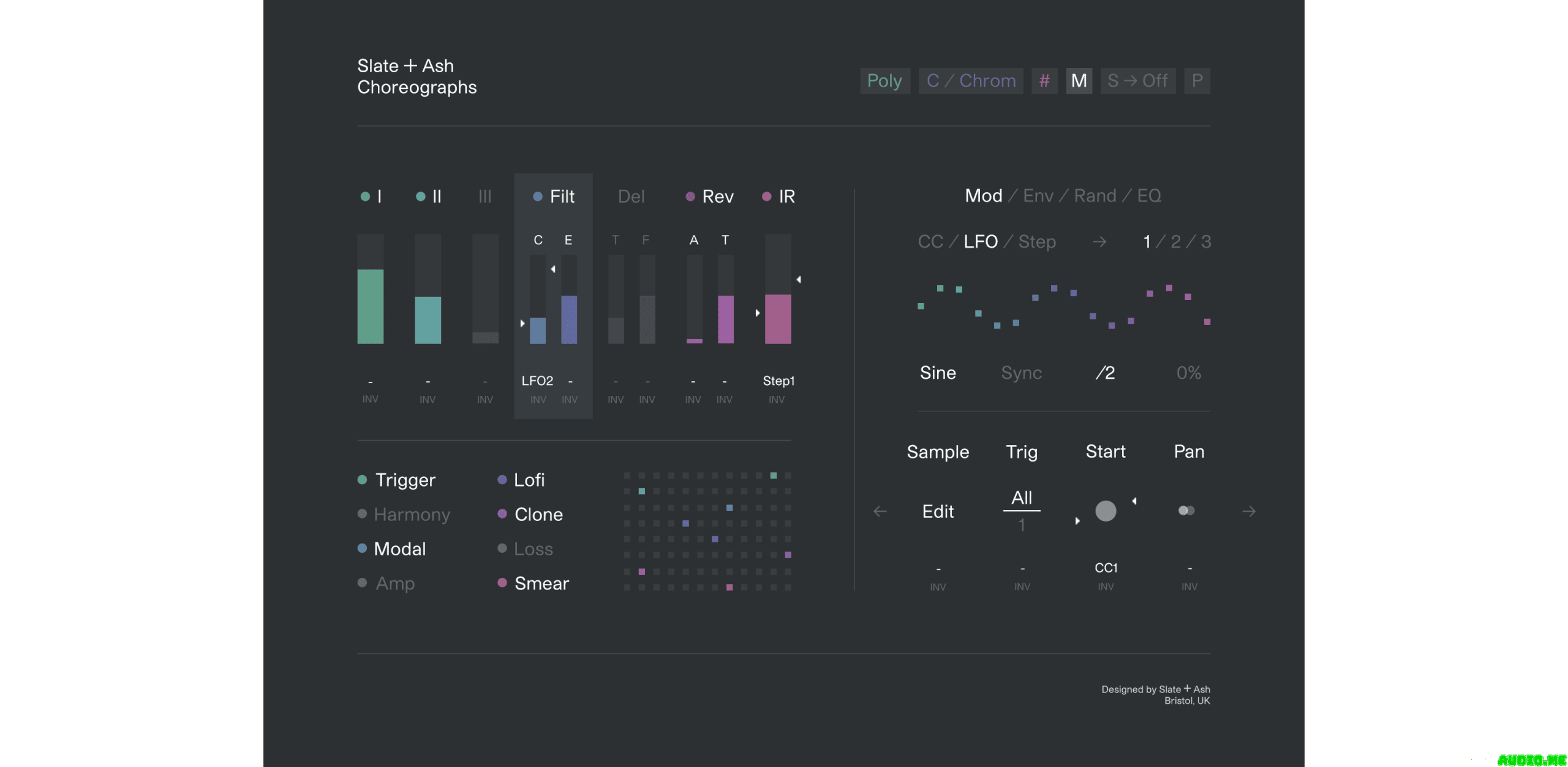 Central to CHOREOGRAPHS is the ability to complexly modulate pitch. As in modular synthesis, the pitch of a voice can be detached from the triggering of its envelope. This blows wide open a whole new methodology of harmonic sequencing — pitches are continuously and instantaneously updated, allowing for intricately plotted sequences, LFO driven melodies, and uniquely fragmented polyrhythms. Everything feeds into a scale quantiser, intelligently pulling pitches into line, turning chaos into harmony.