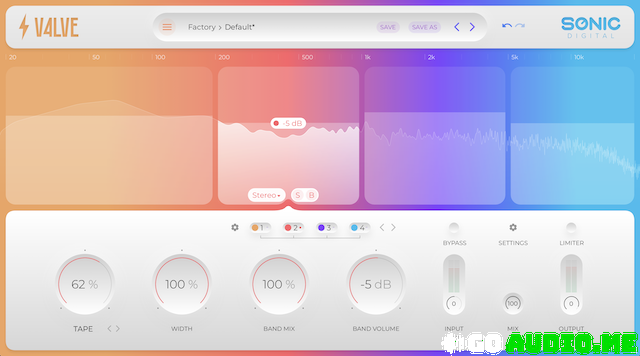 V4LVE’s multiband routing allows you to route the different bands of your signal to different destinations, giving you precise control over your sound. Use any combination of parallel or series distortion / saturation modes to create anything from an exciter, bass enhancer, tube saturator, or a blend of all of these and more.