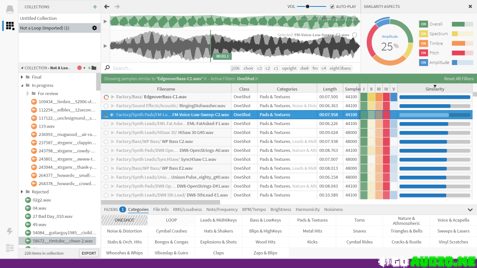 Similarity search enables you to find similar-sounding samples in your sample collection. Basically, pick any sound as input and “see where it takes you” – finding variations has never been this easy. The software can even record live audio and use these recordings to find new samples.