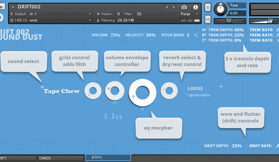 New to DRIFT002 is a three way BPM synced tremolo system which adds extra movement and throb. Control and automate three custom volume LFOs to run at different speeds and different depths to build intriguing rhythmic shimmy…and who wouldn’t want that ?