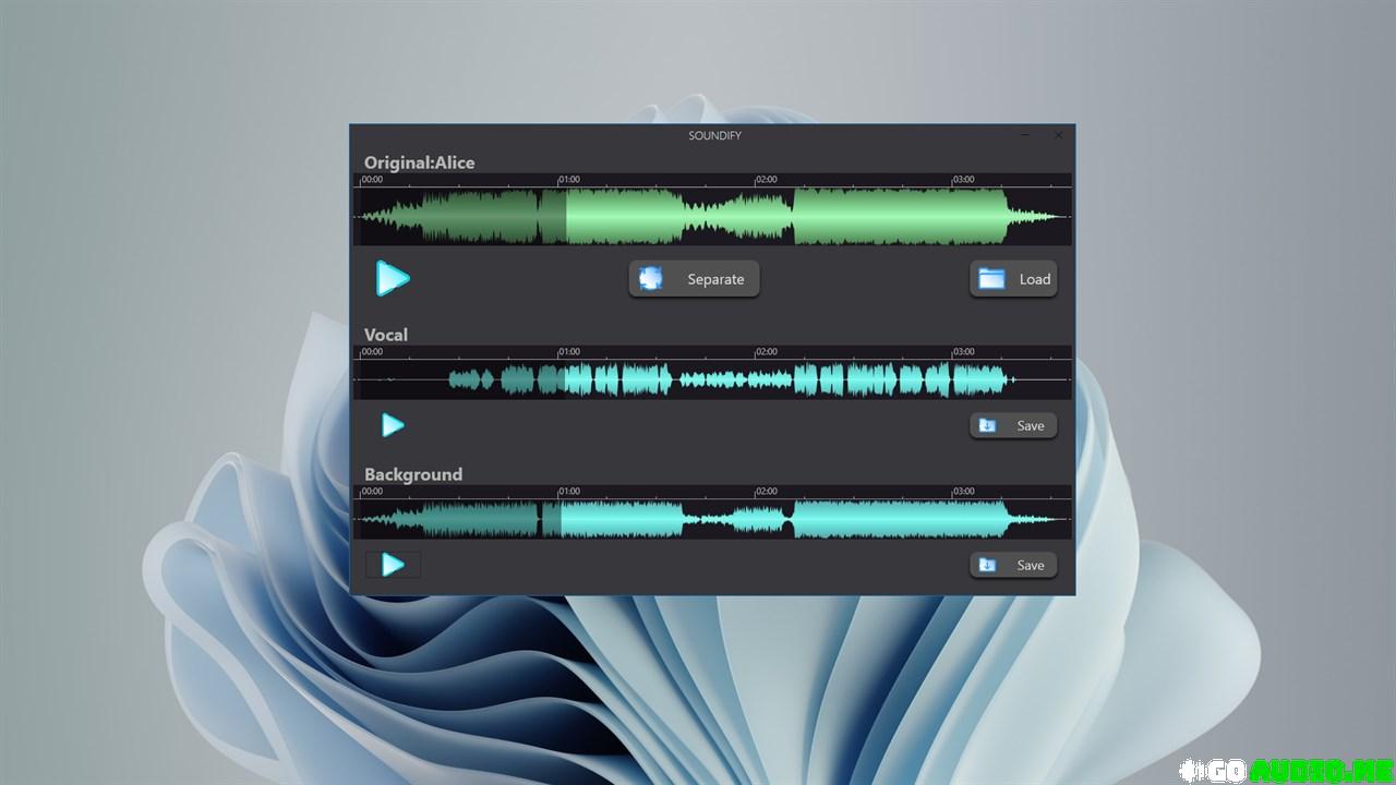 Soundify separates the vocal and accompaniment parts of music based on cutting-edge AI algorithms. Supports multiple source file formats: WAV, MP3, AAC(M4A), AIFF. Just open the original file and click the “Separate” button, the app will separate and generate vocal file and accompaniment file, then you can save the separated files.