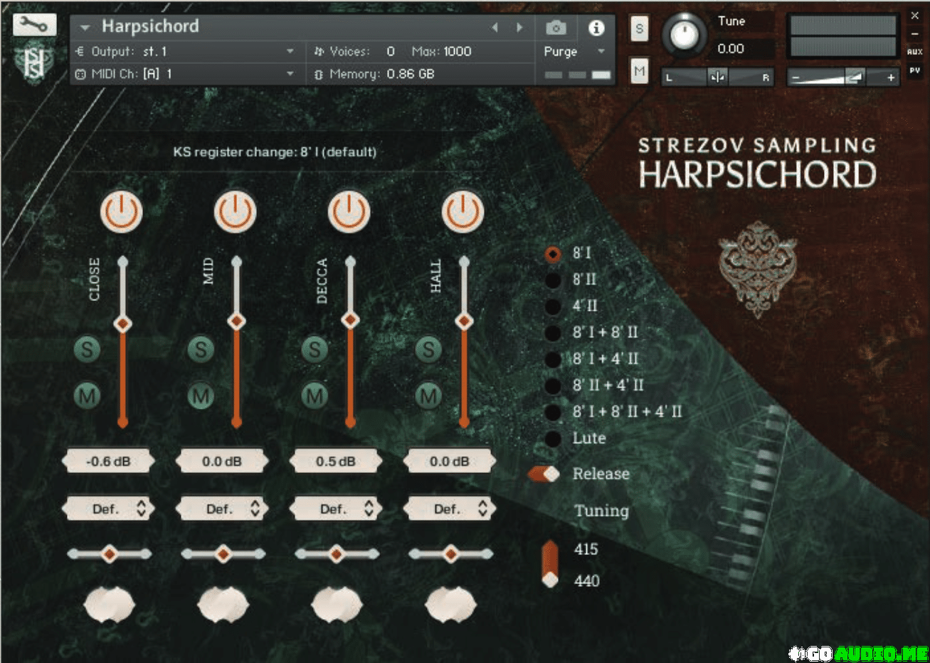 You can opt to turn the release sample set on and off with this toggle switch. There’s also a choice for you between modern tuning at 440Hz, and a more traditional baroque tuning at 415Hz. As with any other of our libraries, you have the opportunity to reset the round-robins of any instrument using the RESET RR with the keyswitch located at C1.