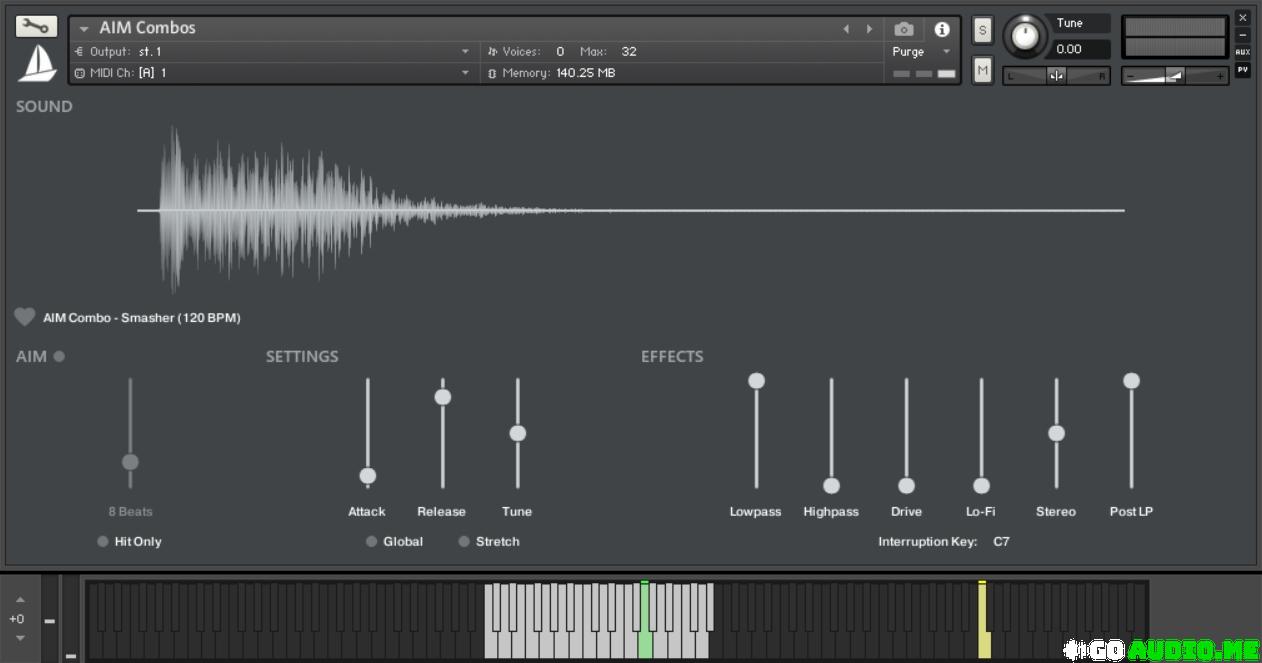The core function of AIM is syncing the “hit points” of samples to the host tempo. Enable the AIM function, set the desired time and press a key – and the sample will hit exactly in that time. Super convenient for transition samples. No dragging across the grid.
