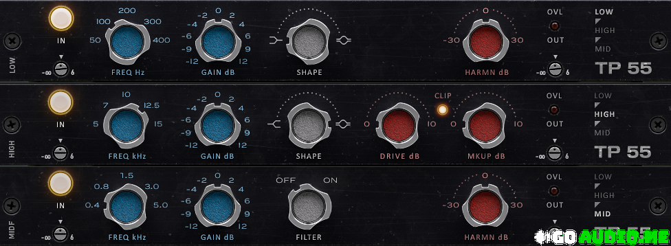 High band and dynamic stage. Features the same shelf to bell interpolation as the low band. This instance also contains a unique subtle low level harmonics which adds a little punch to the signal. The drive control will also clip material. If the low level harmonics feature isn’t desired there is a Instance called NFRD (stands for ‘No Full Range Distortion’) The clip is still featured on this version. Gain -12,-9,-6,-4,-2,0,2,4,6,9,12 Frequency 5,7,10,12.5,15kHz