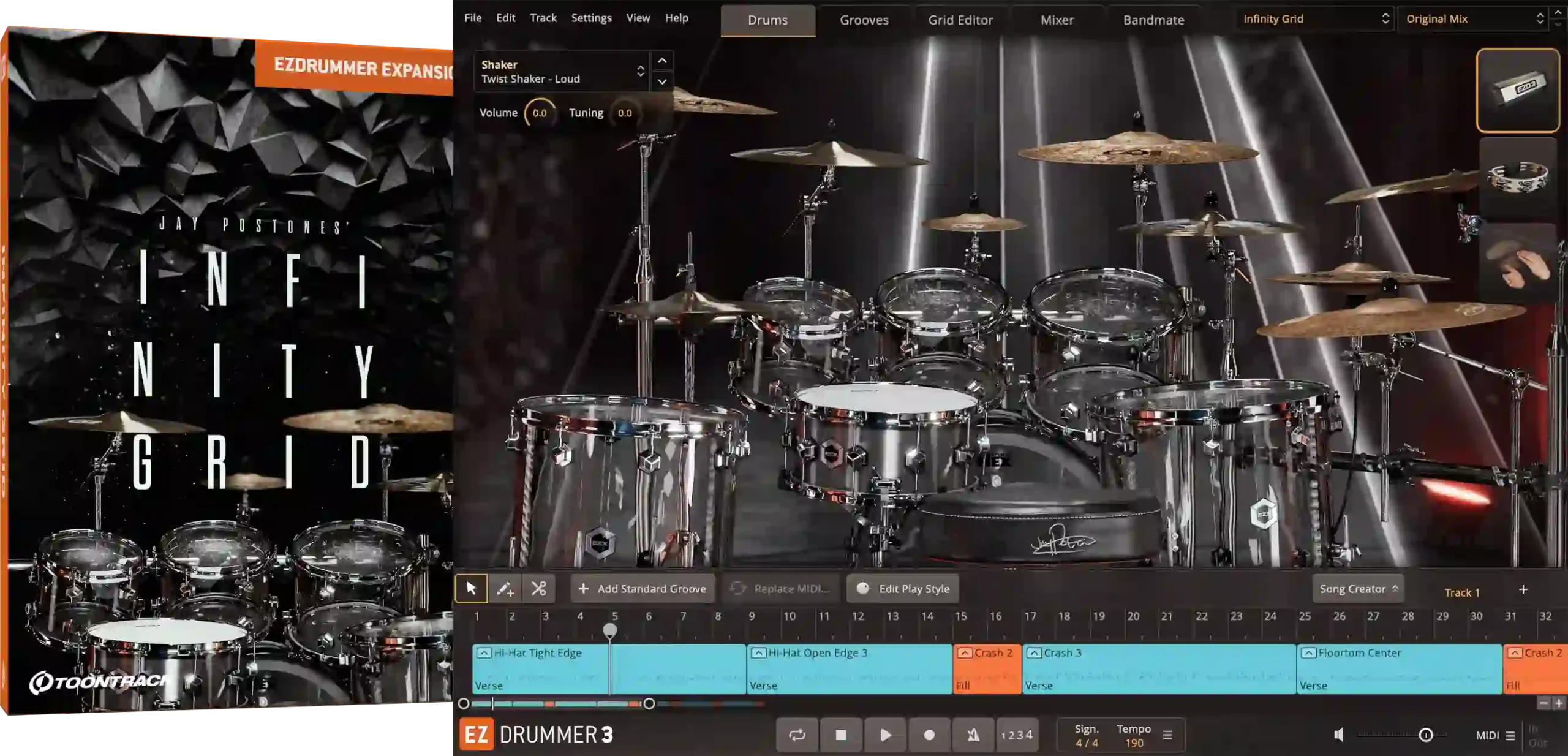 Prog-metal project in the works? Toontrack’s Infinity Grid EZX pack is your pulse! Recorded in the highly reflective Back Stage room of Nashville’s Sound Stage Studios under the sticks of TesseracT drummer Jay Postones and the engineering skills of Steve Blackmon, Infinity Grid EZX is a thorough expansion pack that gives EZdrummer and Superior Drummer users total access to the darkest, most momentous drum samples that modern prog-metal musicians demand. Armed with huge tones from three dynamic kits, you’ve got your choice of five kicks, ten snares, 15 toms, 22 cymbals, and two hi-hat pairs to build a drum set that perfectly complements the energy of your next release. A wealth of layered one-shot samples and mix-ready drums, engineered alongside TesseracT guitarist Acle Kahney, unveils a vast range of hard-cutting expressiveness right at your fingertips. Access to standard MIDI grooves and raw, non-texturized Original Mix drum samples provides even more versatility. From delicate rhythmic subtleties to Armageddon-esque breakdowns, the power and dynamic versatility of Jay Postones’s playing within Infinity Grid EZX provides unending prog-metal potential.