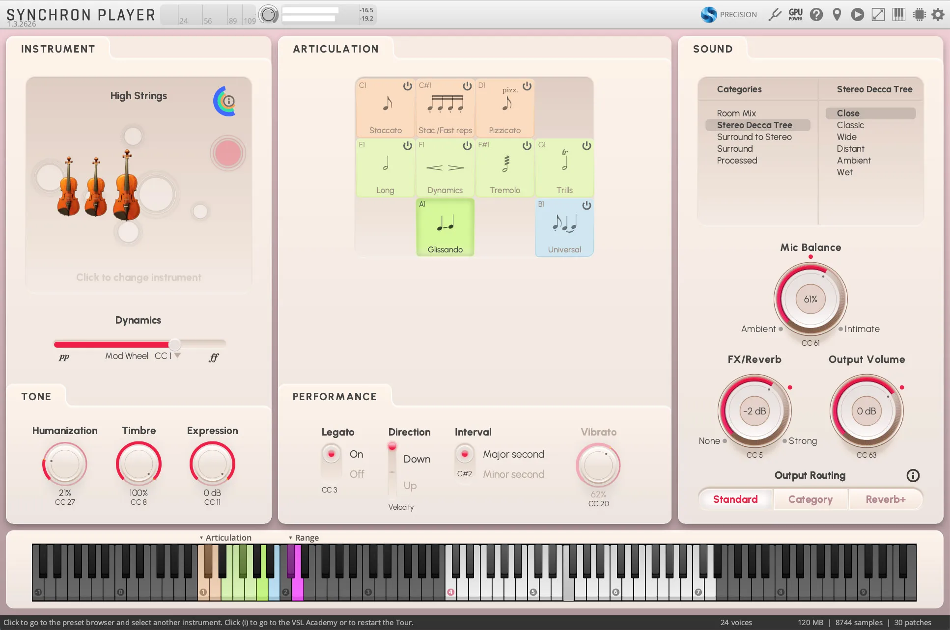 The High Strings patches capture the soaring elegance of Vienna’s finest string players. With 14 first violins, 12 second violins, and 8 violas performing together – the violas an octave below the violins – this ensemble offers a broad and balanced tone that is ideal for lyrical melodies, sweeping themes, and radiant textures.