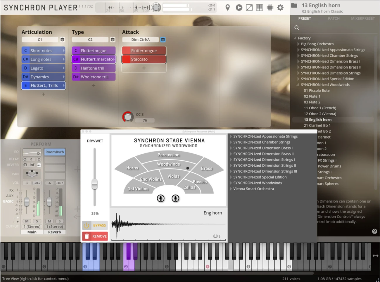 For SYNCHRON-ized Woodwinds, Vienna’s software developers incorporated a specifically designed convolution reverb derived from Vienna MIR Pro into the Synchron Player, featuring the outstanding and unique ambience of the 540 m² (5,813 sq.ft.) main hall of Synchron Stage Vienna. The perfectly engineered reverberation and placement presets combine customized impulse responses with expertly crafted reverb settings for each instrument. By adding the ambience of Synchron Stage Vienna’s Stage A to the dry samples in real-time, SYNCHRON-ized Woodwinds perfectly blend with every other product in the Synchron Series, resulting in a production-ready sound “out of the box”.